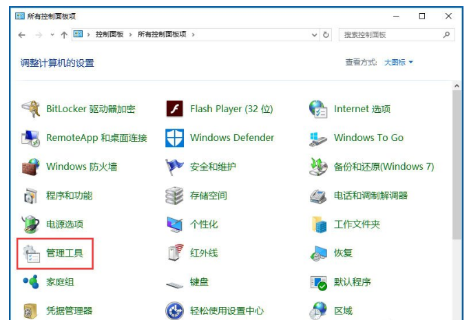2、在打开的控制面板窗口,找到并点击“管理工具”图标;