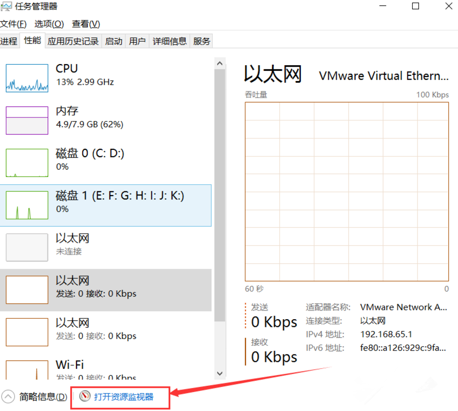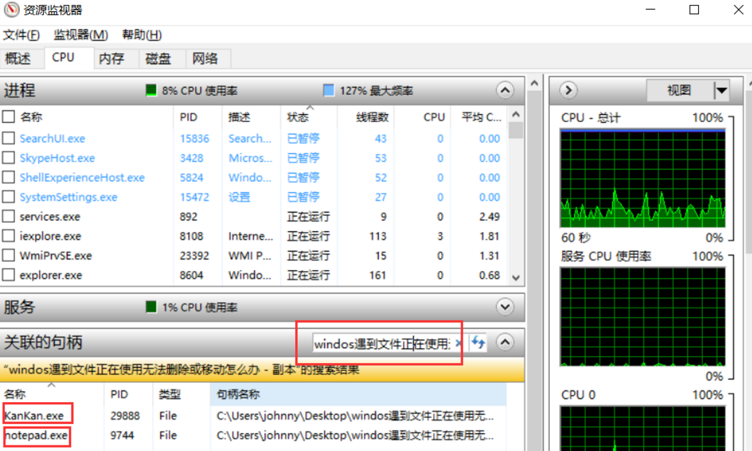 6、在资源监测器页面,点击第二个标签【CPU】,在下面我们可以看到关联句柄,