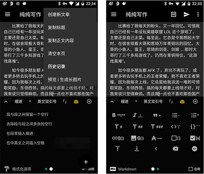 除了能让用户放心内容的安全外,纯纯写作也非常注重写作体验和效率!它干净、简洁、流畅、无后台、拥有很多方便的快捷输入的辅助功能,并且支持Markdown语法写作,可以说是安卓上一款非常好用的手机 Markdown 编辑器了。