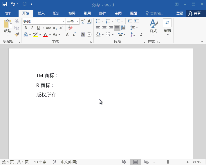 TM商标快捷键【Alt+Ctrl+T】:R商标快捷键【Alt+Ctrl+R】:版权符号快捷键是【Alt+Ctrl+C】:
