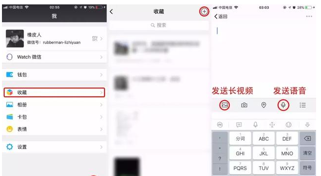 点击「我」页面选择「收藏」,点击收藏页面右上角的加号即可进入新建收藏页面。这时,我们可以添加相册图片、视频、语音、位置、待办事项等。