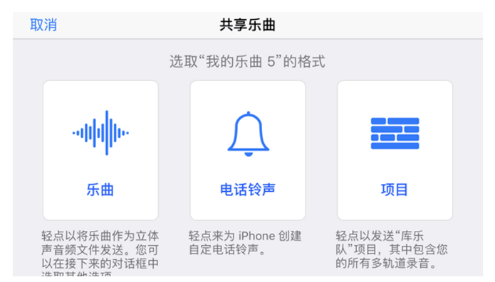 找到已经保存为「我的乐曲」的这个文件。长按,呼出这个文件可操作的选择,对文件进行「共享」操作,选择「电话铃声」。将这段乐曲导出到电话铃声中。