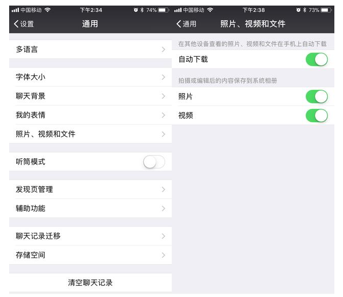 此外,微信内置自动下载功能,当用户在其他设备查看照片、视频和文件时会在手机上自动下载,对于大多数用户而言这一功能并没有多大作用,但需要强调的是关闭这一功能后,聊天对话如果有重要紧急资料,记得及时保存在手机上。具体操作:我-设置-通用-照片、视频和文件-全部关闭即可。