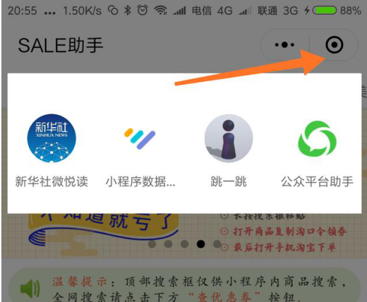 每个小程序的右上角都有三个点“。。。”和一个圆点“⊙”符号。三点符号功能:“转发”、“添加小程序到手机桌面”和查看“今天说说小程序”三项。