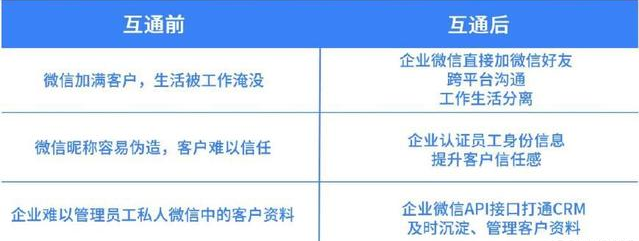 这样看来,企业微信与微信的互动功能将解放个人微信,对于企业的客户将直接采用企业微信直接添加,不再介入你的个人生活,从此工作生活两不误。