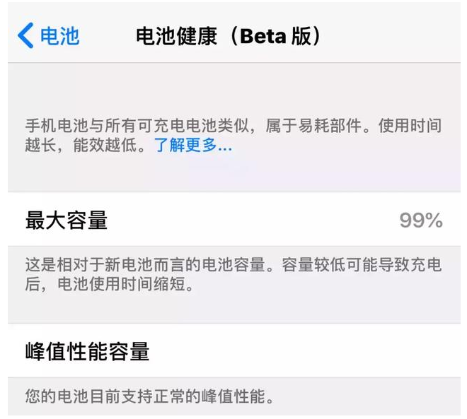 之前有很多使用6、6s、7的朋友因为升级了新版本系统遭到了CPU的限制使用,致使系统变得非常卡顿,在这个版本中,大家可以打开电池健康功能,检测自己的电池健康程度,如果已经低于60%,那么建议最好去苹果官方店更换新的电池,以保持系统的运行速度。