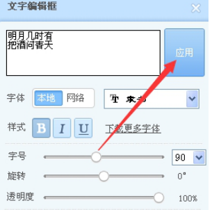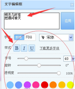 6.点击输入文字后,会跳出文字编辑的界面,在输入框输入想要的文字,在输入框下端是文字编辑项目,设置文字的大小、颜色、字体等等,如图。