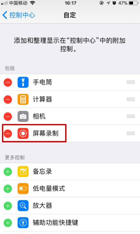 我们打开手机系统设置———控制中心————自定控制————更多控制,添加屏幕录制。