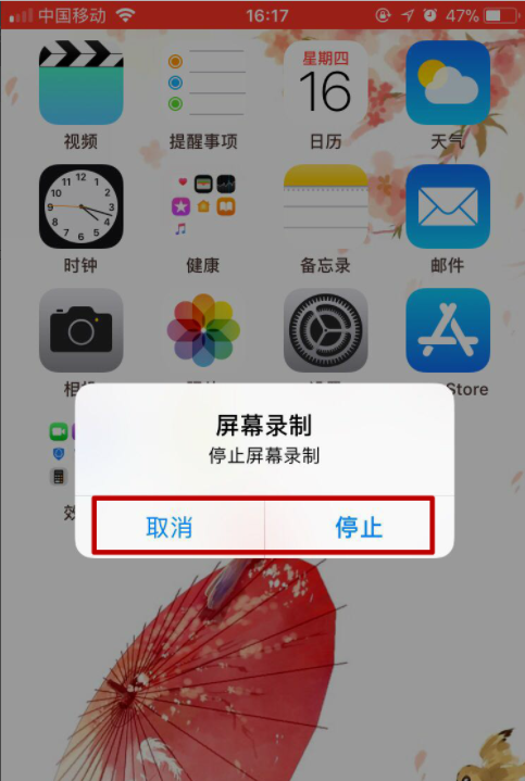 想要结束屏幕录制,点击上方的红色条,点击停止录制。