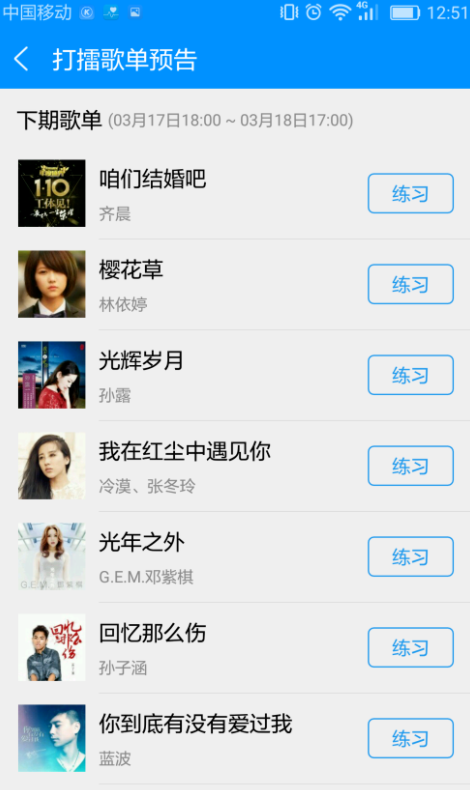 3、点击“打擂歌曲”下方“打擂歌单预告”,可查看下期30首打擂歌曲,也可提前练习准备。
