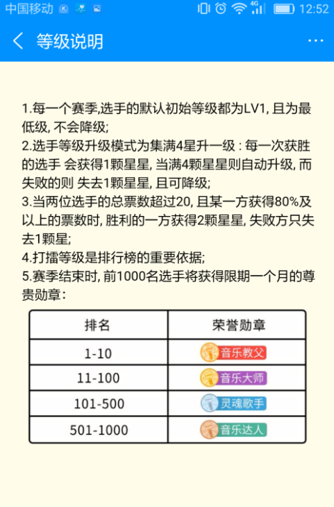 10、进入“等级说明”页面,可查看账号升级、降级、荣誉勋章等打擂规则说明。