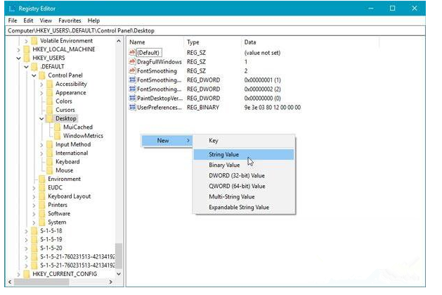 现在导航到这个路径:Computer\\HKEY_USERS\\.DEFAULT\\Control Panel\\Desktop
