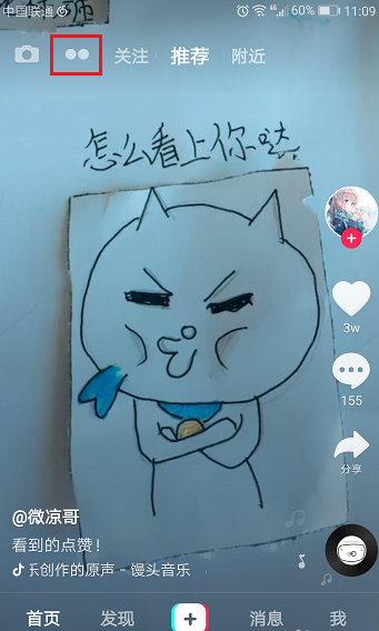 打开抖音短视频APP,进去首页,点击上方的两个点的图标,如下图所示:
