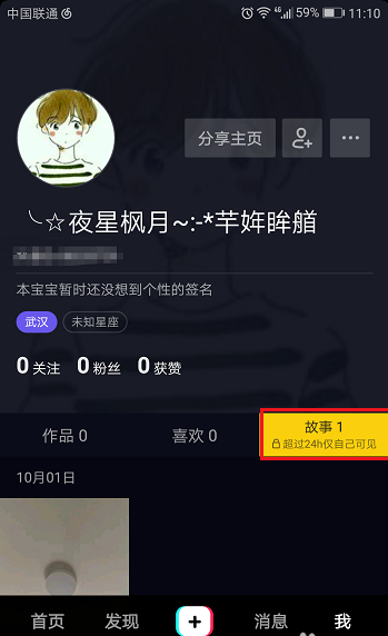 回到个人界面,点击底部我,可以看到已经发布了一个故事,只24h对外展示,然后就属于自己的故事视频了,如下图所示: