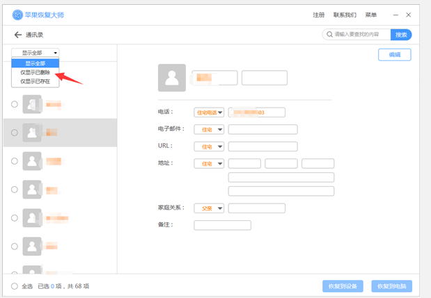 6、查看已删除联系人,勾选要恢复的联系人,在右侧【编辑】可对联系人信息进行修改。