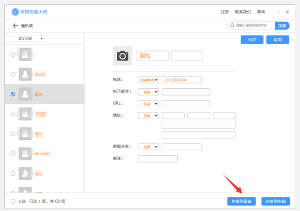 8、点击【恢复到设备】或者点击联系人头像右侧恢复到iPhone的图标直接恢复至设备。