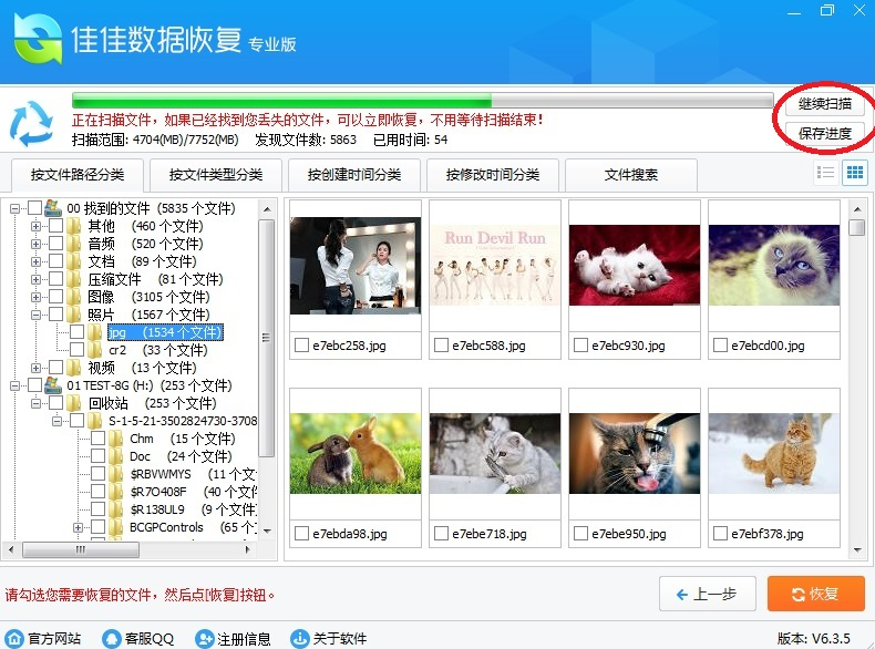 您随时可以点击右上角的“暂停扫描”按钮,暂停扫描;点击“保存进度”按钮,保存当前扫描到的数据,方便下次继续扫描。