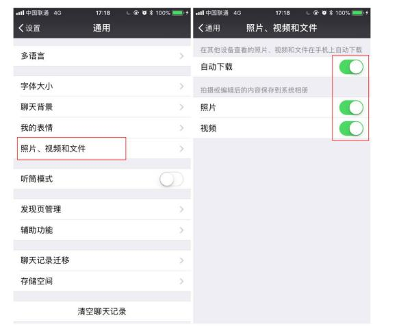 解决方法:打开微信,点击我→设置→通用→照片、视频和文件,把所有的选项关闭即可。