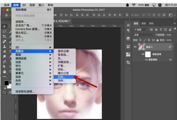 6、模糊处理后,选择“滤镜-风格化-凸出”。