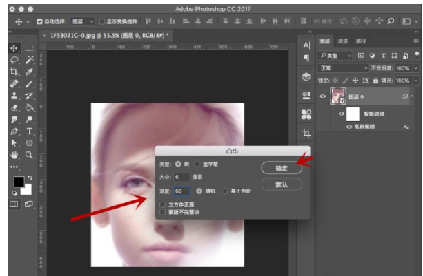 7、在凸出弹框设置中,类型选择块,大小不用过大,6Px左右就行了,深度60,选择随机,点击“确定”。