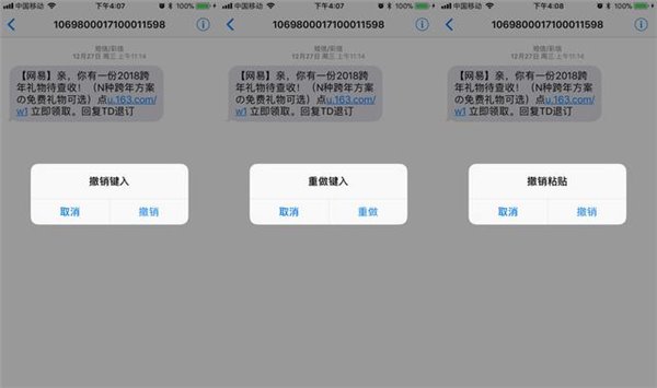 编写短信的时候,如果想把写的内容全删掉,只需晃动你的iPhone几下,会弹出个窗口,选择“撤销键入”就可把内容全删掉了,不用按着删除键半天。如果想把刚删掉的内容恢复,晃动iPhone选择“重做键入”,刚删掉的内容就回来了;如果是刚粘贴过来的,晃动可以“撤销粘贴”。