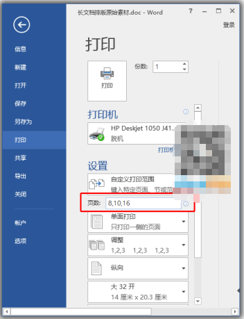 我们需要打印其中某些单独不连续的页面时,比如,这里我想打印第8页,第10页,第16页,我们可以输入【8,10,16】。