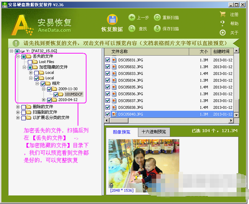 3、在出来的目录浏览界面中,有个“丢失的文件”目录,下面有“加密隐藏的文件”目录,在里面找回了丢失的相片文件。