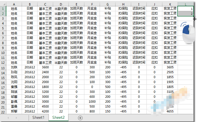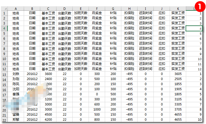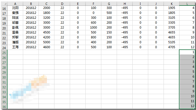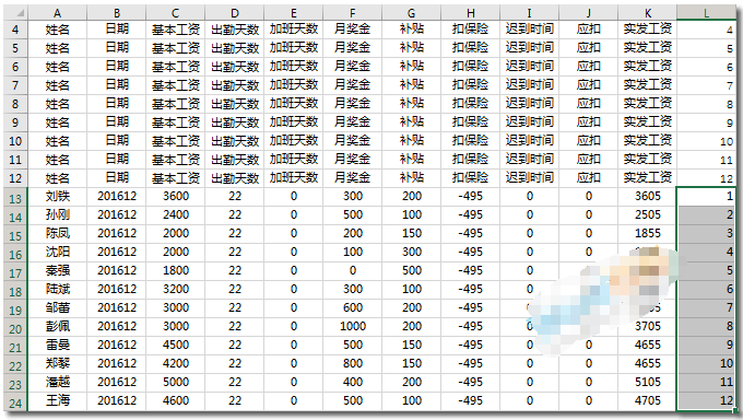 步骤二、同样将所有姓名工资情况右边也给上辅助数据1、2、3……12序列填充。