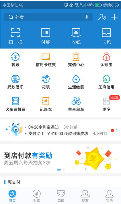 打开支付宝APP,首页滚动宣传处,到店付款有奖励!
