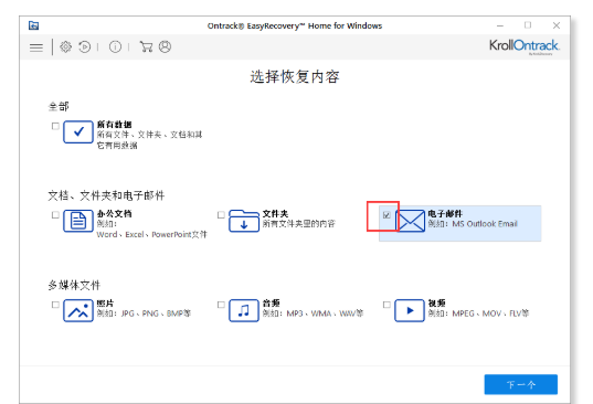 打开EasyRecovery专业版,进入第一个操作界面,这里我们选择恢复“电子邮件”,点击右下角的“下一个”。