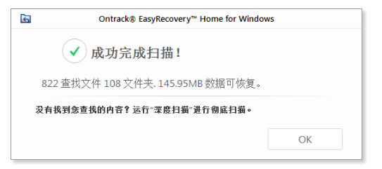 选择好恢复内容后,我们先选择恢复位置,然后进行扫描,扫描过程中不需要任何操作,等待软件自动扫描完成,就会弹出如下图所示的对话框,直接单击OK即可。