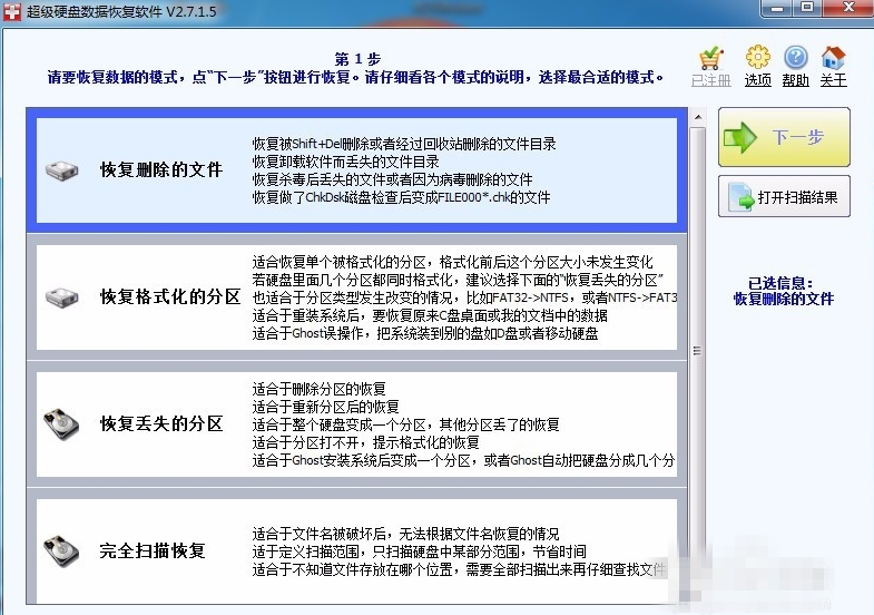 打开超级硬盘数据恢复软件,选择“恢复删除的文件”这一项,本教程是电脑本机的C盘数据的恢复。