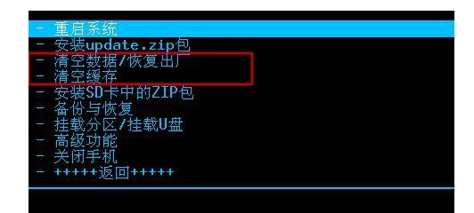 然后执行上图中绿色区域的清空数据和清空缓存两项,这两项是必须做的,如果手机的锁屏密码忘了,执行这两项后就可以清除手机密码。