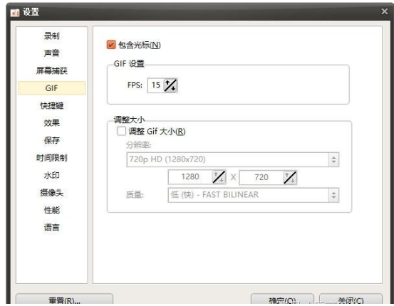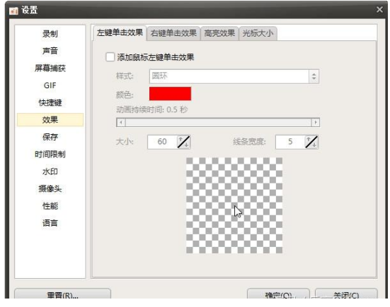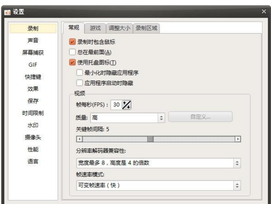 点击录屏选项框内的菜单或者鼠标右键打开软件设置(选项)界面。如图,在设置界面我们可以设置录制视频的快捷键、分辨率、帧率、鼠标效果等参数;