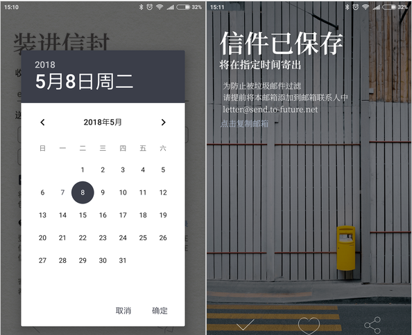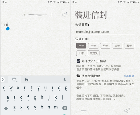 给未来写封信App写信的界面可以看得出也是经过精心设计的,仿信纸的界面给App增添了不少实感。写信支持语音信息和文字信息,你可以录一段音频、写一段文字给未来的自己。接着,你就可以填写邮箱,把信件投递出去了,这封信会根据你选择的时间,在半年后、一年后乃至十年后,发到你的邮箱当中。如果你在App中登录了微信,收信日到了还能够利用微信来自动提醒,免得错过信件。