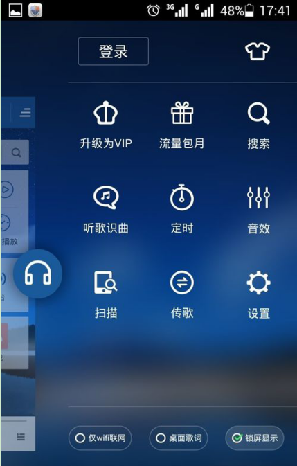 两部手机都进入酷狗音乐主页面,然后点击右上角的三个横杠的梯形图标,进入下一画面。
