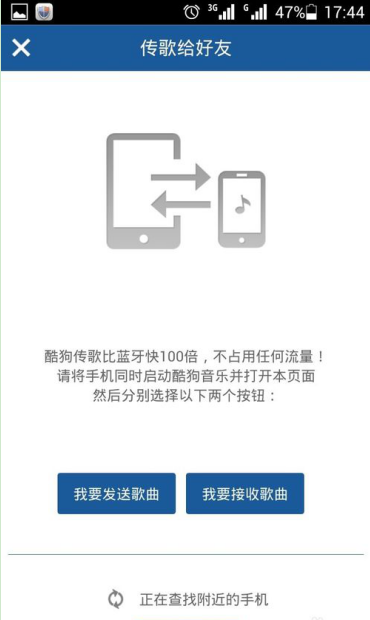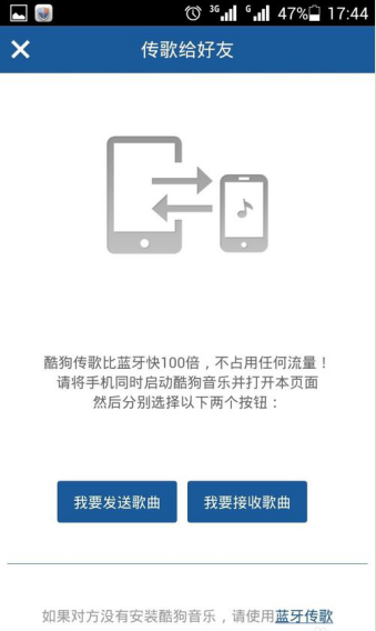 出现了“传歌给好友”画面,这时,两部手机分别点击“我要发送歌曲”、“我要接收歌曲”。