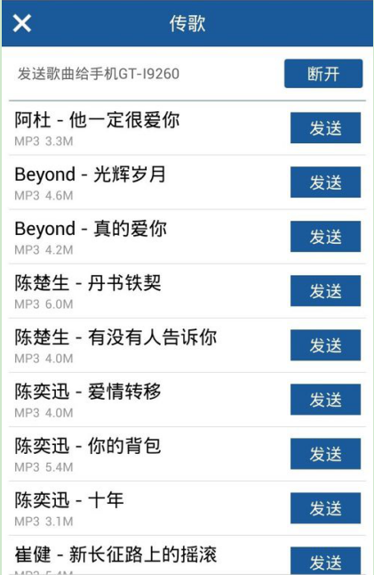 想要传歌给对方的手机屏幕显示出你全部的歌曲,选择你想发送的歌曲,点击歌曲右面的“发送”按钮。