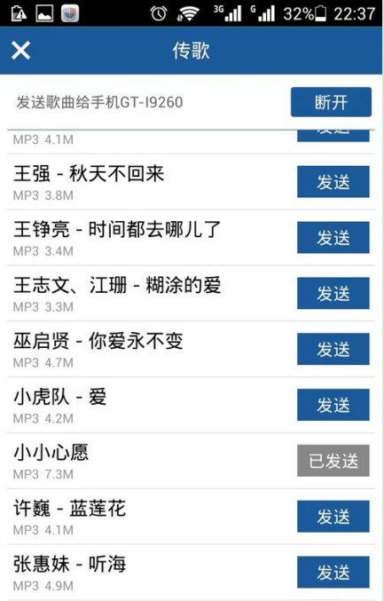 很快,歌曲就传到另一部手机上了,这时,你的手机发送的歌曲显示“已发送”,如果还需要再发送其他歌曲,重复操作,如果不需要了,拖动滚动条到最上方,与连接的手机“断开”连接即可。