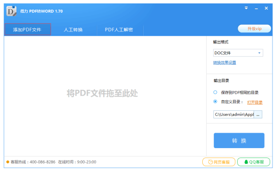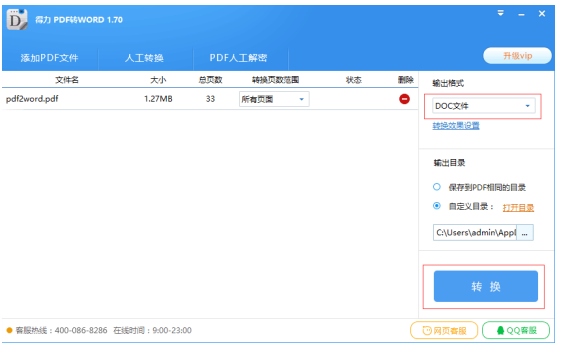 打开文件后,设置转换输出格式默认原生doc,点击“转换” (如果文件超过5页,需要升级VIP版本),