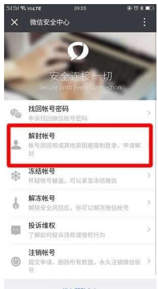 进入【微信安全中心】界面后,点击【解封账号】申请或其它操作;