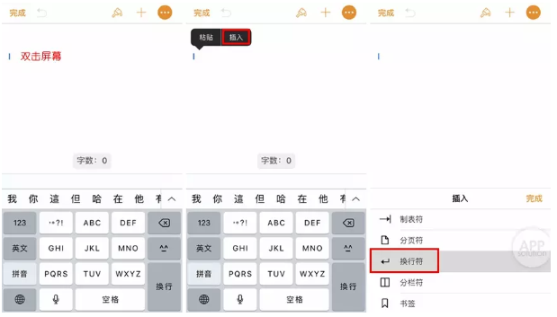 首先,打开iPhone自带的Pages,新建一个空白文档。在文档空白处双击,点击「插入」,选择「换行符」。