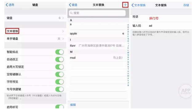 接下来需要用到「文本替换」功能。在「设置」-「通用」-「键盘」-「文本替换」中,新建一个项目。