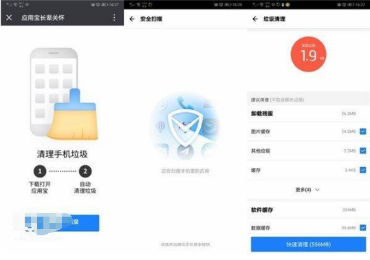 “垃圾清理”、“手机优化”和“安全扫描”这三个功能,实际上三个功能的实现并不是依靠应用宝,而是腾讯手机管家里面的功能。