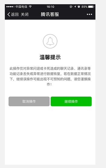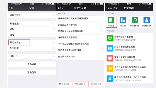 打开微信设置-帮助与反馈-快捷帮助-异常修复,提示此操作仅对异常闪退或卡死造成的聊天记录、通讯录等功能记录丢失或异常进行数据恢复。