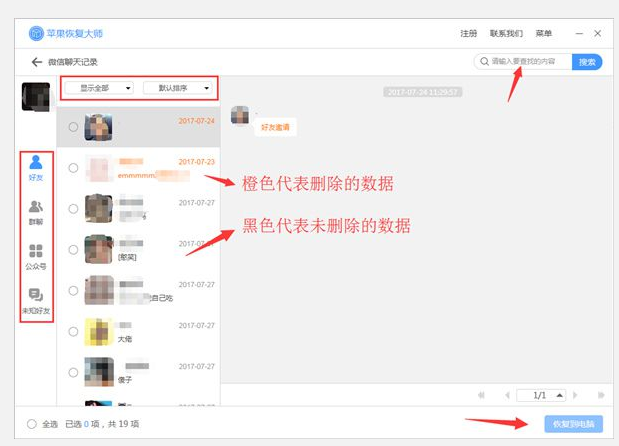 待软件扫描完成,扫描完毕我们就可以查看到扫描结果。以恢复微信文字聊天记录为例:橙色字体是已经删除的微信聊天记录,黑色字体是未删除的微信聊天记录,勾选需要恢复或者导出的微信聊天记录,点击【恢复到电脑】即可~