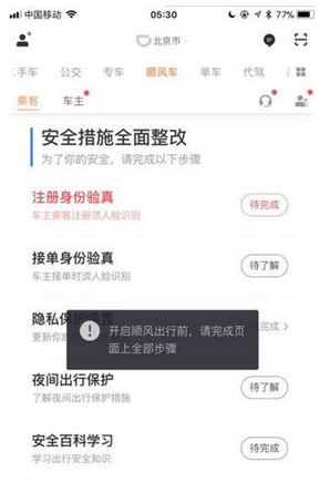 在滴滴出行APP上看到,这6项措施包括注册身份验真、接单身份验真、隐私保护设置、夜间出行保护、安全保障学习、顺风车出行保障6项措施。少任何一项,都无法使用顺风车。身份验真中,滴滴顺风车要求乘客和车主均需上传身份证照片。而记者发现,这一上传,只能使用“拍照”功能,而没有“从图库中选择”功能,也就是说上传的身份证只能是现场拍摄的,而不能使用图片和此前拍摄的照片。上传身份证后,还需要进行人脸验真,均完成后才能完成该项任务。