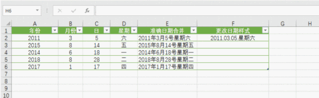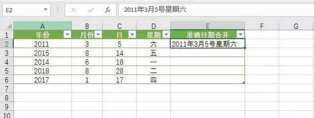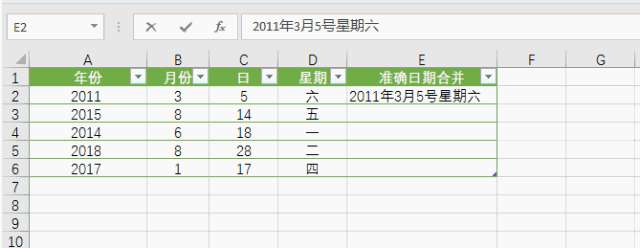 只需要写一行:2011年3月5号星期六,然后把光标放到下一行需要合并的单元格内,使用Ctrl+E快捷键就可以全部填充。