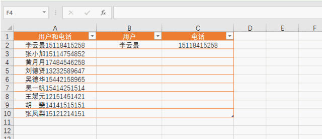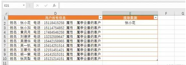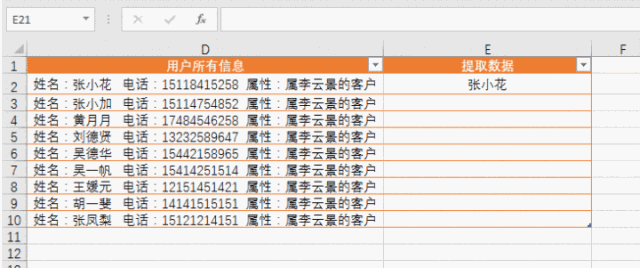 如下图,我们先写好第一行,让Excel能够识别拆分的样式:姓名:张小花 电话:15118415258 属性:属李云景的客户