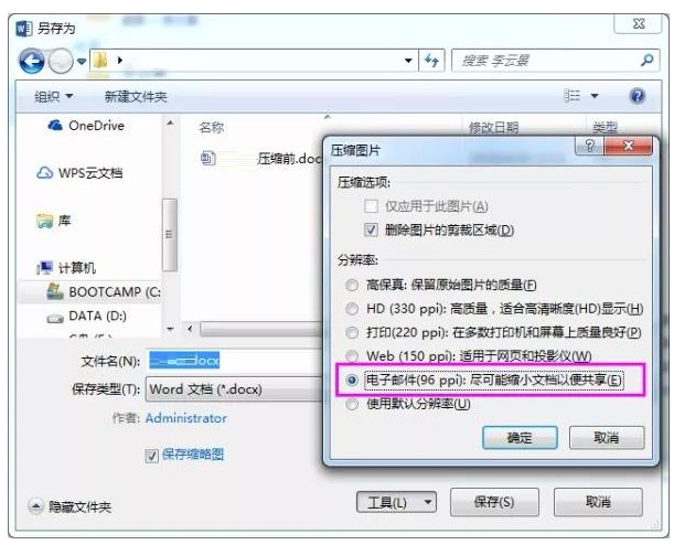 在保存文档时,选择【工具】,选择【压缩图片】,
